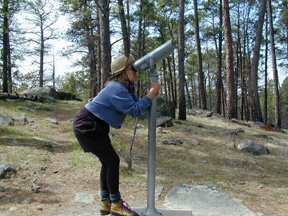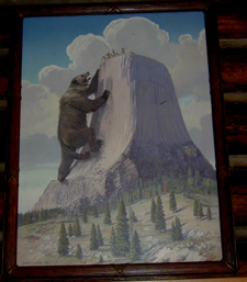 I used an Olympus digital camera to capture the image on the right from a painting hanging on the wall of the Devil's Tower visitor's center. On the surface, this painting Communicates the legend of a Bear chasing seven maidens. The Great Spirit decides to help the maidens by having a tree stump they are standing on grow to gigantic proportions so that the Bear can not reach them.
