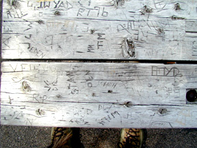From the visitor's center we began to walk around the tower on the 1.3 mile paved trail that never goes far from the base of the monolith. In the previous image you can see the relatively narrow East prow of the Tower. Along the trail were wooden benches carved with the initials of visitors along with permanent observation binoculars that people were welcome to use to get a closer look at the climbers.